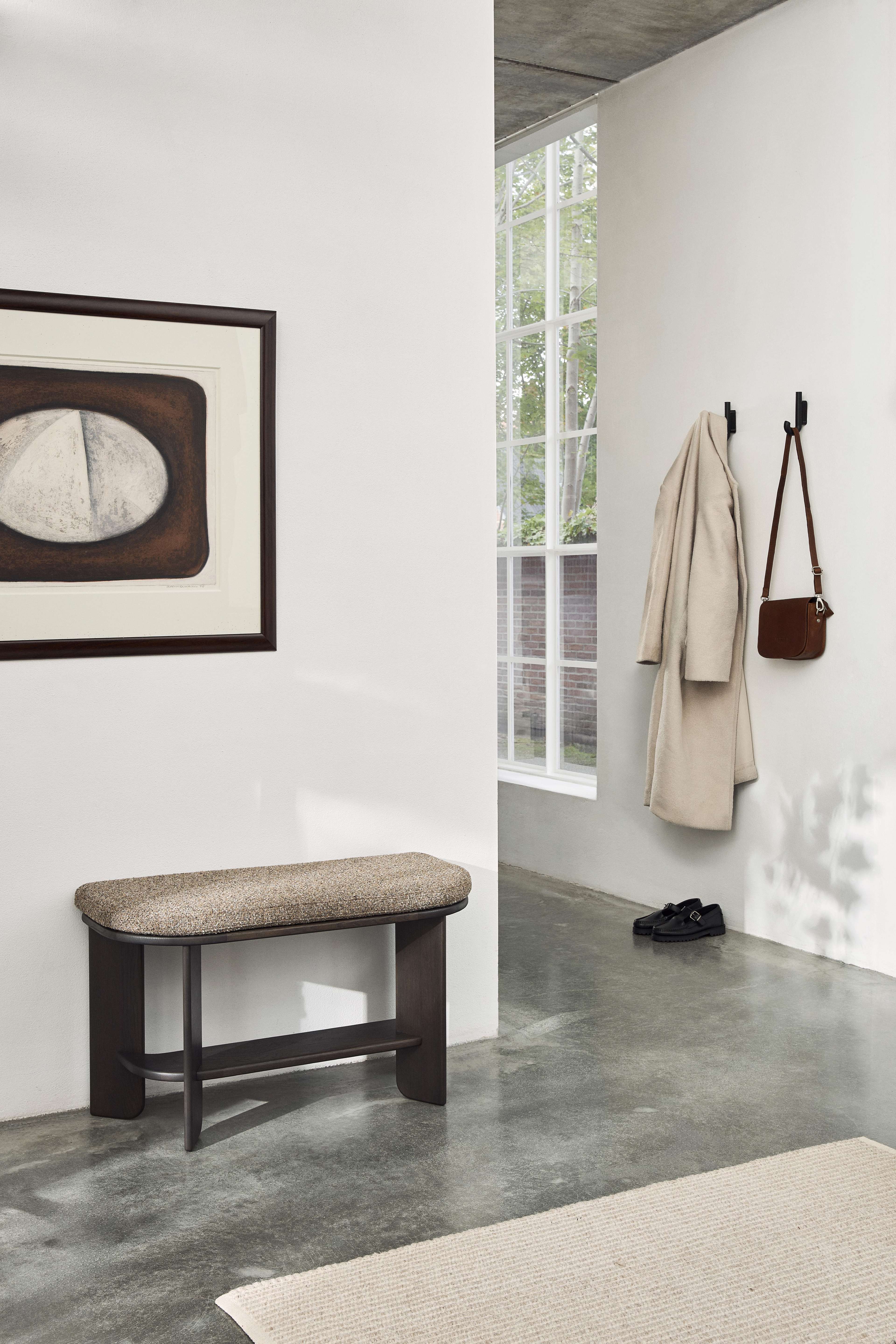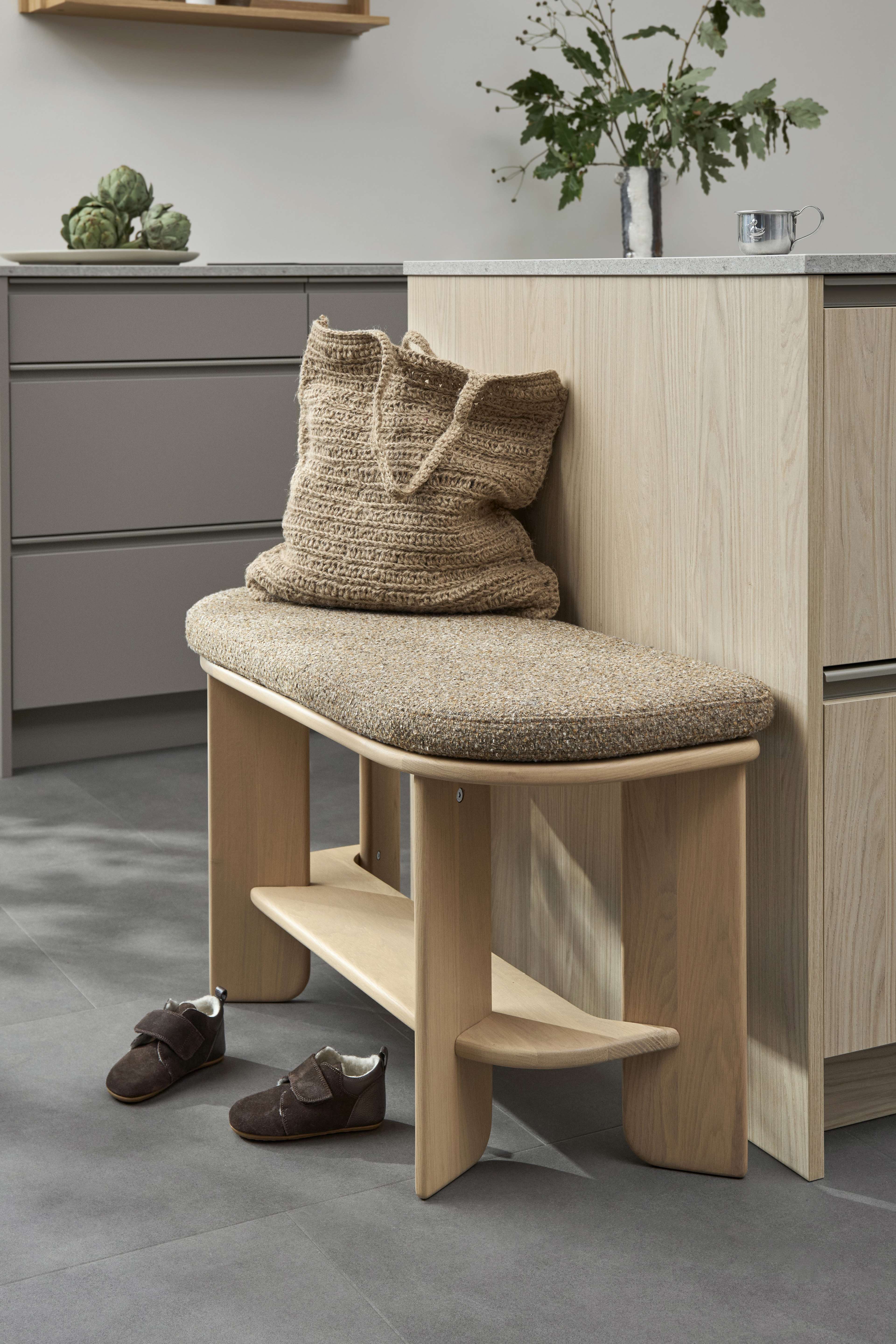 Its sculptural oak form, available in light or dark tones, is both soft and architectural, balancing everyday function with timeless design. The curved edge and optional cushion in warm cinnamon add comfort and character, while its versatility allows it to move effortlessly from kitchen to dining space or hallway.